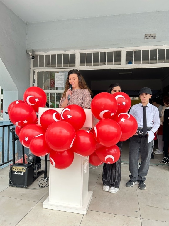 Gazi Mustafa Kemal Atatürk tarafından tüm dünya çocuklarına armağan edilen 23 Nisan Ulusal Egemenlik ve Çocuk Bayramı'nı ve aynı zamanda Türkiye Büyük Millet Meclisinin açılış yıl dönümünü şiirler, dans gösterileri ve konserler eşliğinde kutladık. Bize bu güzel bayramı armağan eden başta Mustafa Kemal Atatürk, silah arkadaşları ve aziz şehitlerimizi saygıyla anıyoruz. Törende emeği geçen öğrencilerimize ve Türkçe öğretmenlerimiz; Deniz SARIBUDAK, Özgül KOÇER; müzik öğretmenimiz Kayhan AYTEMİZ'e teşekkür ederiz.